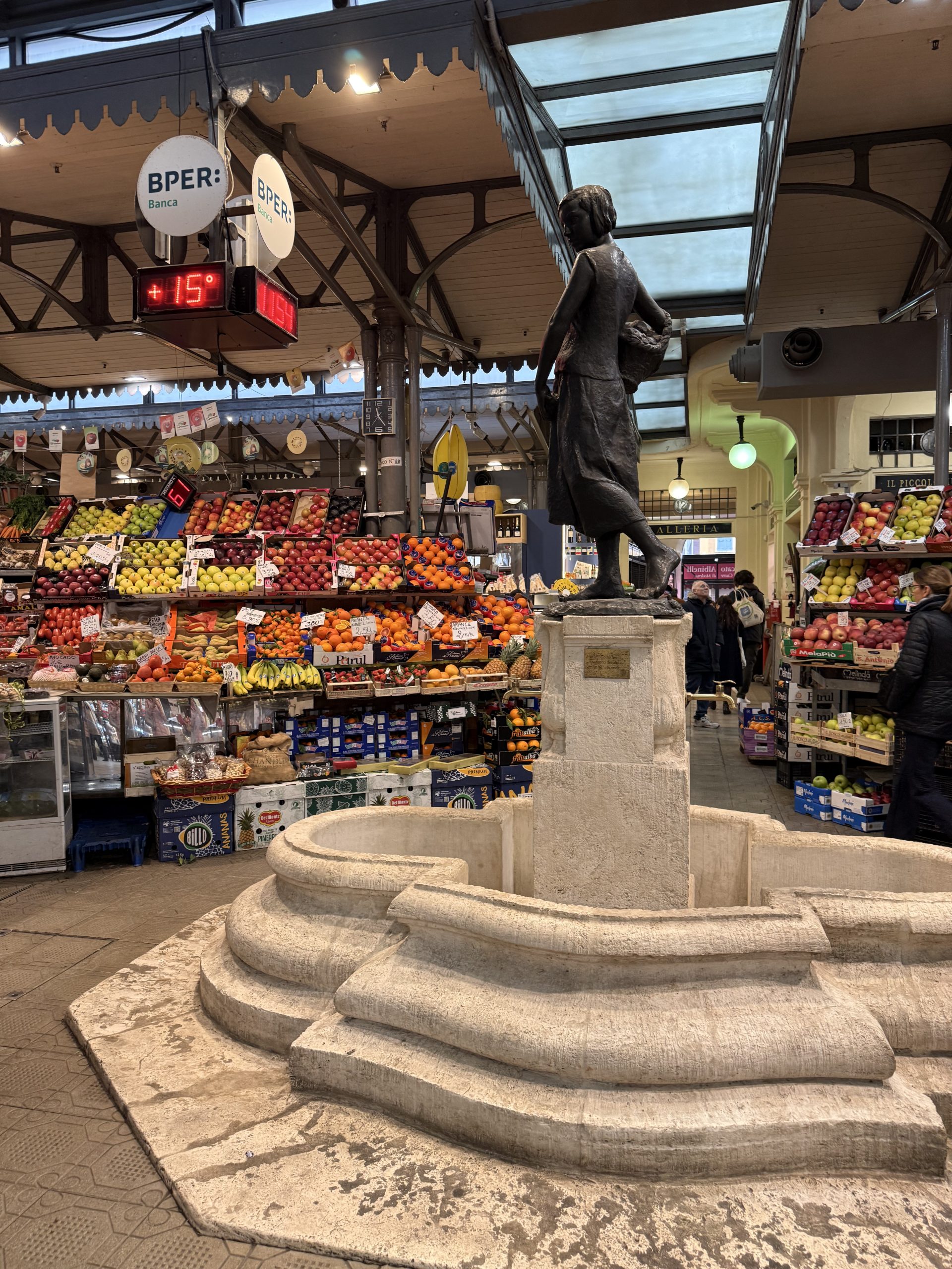 At the centre of the market stands a small fountain with a statue known in Modenese dialect as la Ragazzola. It was not just a statue; it was a meeting point. People would say, “Let’s meet at the Ragazzola”, and everyone knew exactly where to go.